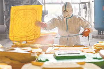 新冠肺炎疫情發(fā)生后,每天產生的巨量醫療廢物成為武漢市亟待解決的重要問題。圖為近日,在武漢市青山區云峰公司,工作人員在對醫療廢物轉運箱消毒。新華社記者 才揚 攝3月11日,記者從國務院聯防聯控機制新聞發(fā)